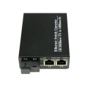 This Ethernet media converter can interconvert electrical signals of 10Base-T and 100Base-TX twisted pairs with optical signals of 100Base-FX. Extends the network transmission distance from 100m via copper cables to 120km via fiber optical cable. Enables the data to transmit in two different mediums of electrical and optical networks either by the technology of data link L2 store-and-forward, or by the one of PHY L1 cut-through). Supports transmission in multi-mode dual fiber, single-mode dual fiber, single-mode single fiber.