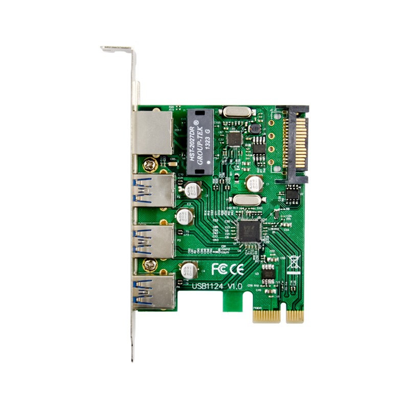 - Adds three USB 3.0 ports and one Gigabit Ethernet (RJ45) port through an available PCI Express slot